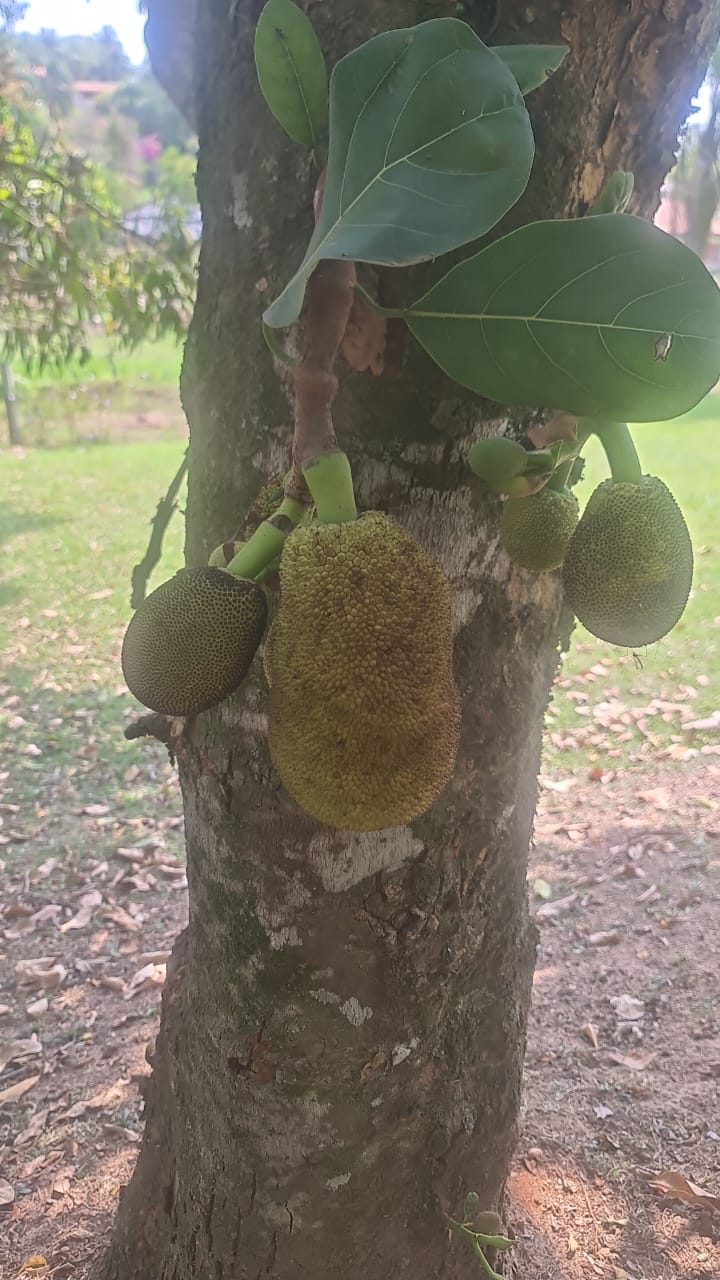 Jabuticaba (8 pés), manga, jaca, pera, banana, mexerica, laranja, lichia, lima e caqui