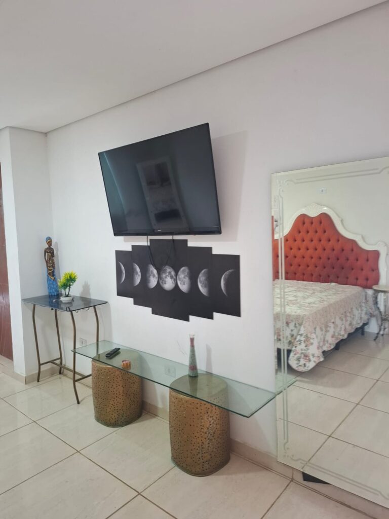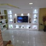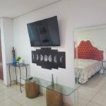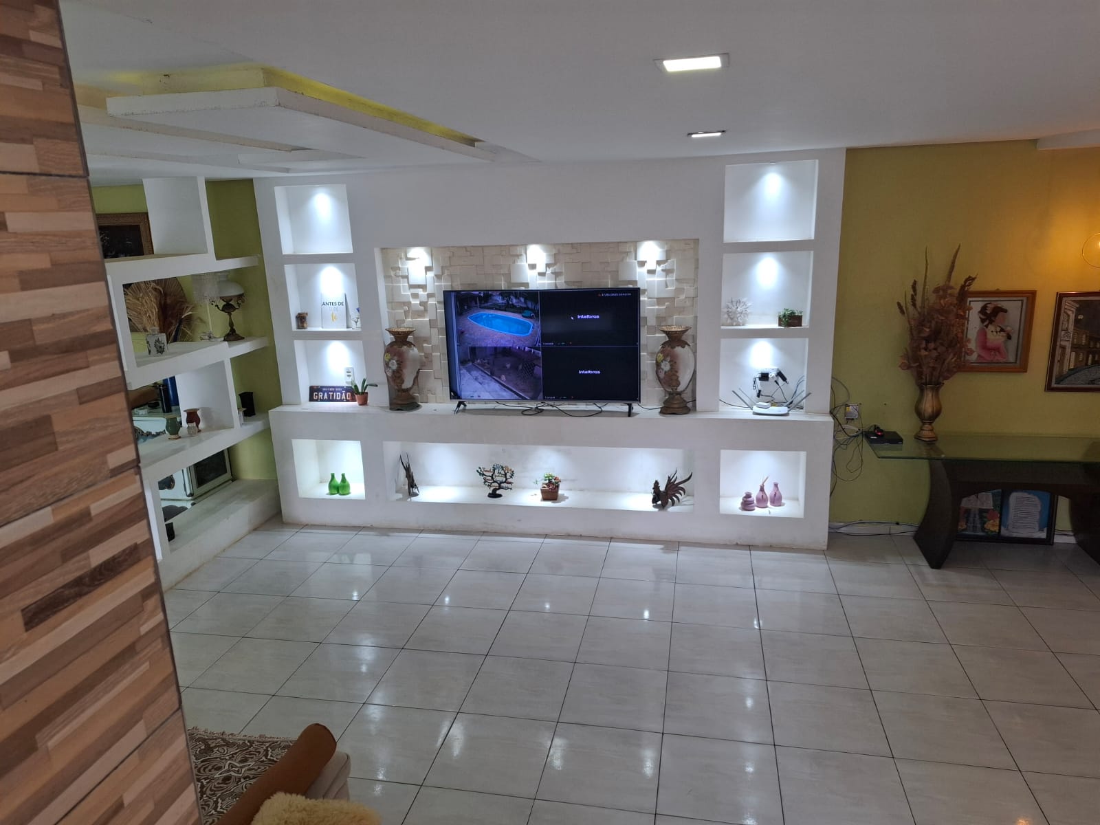 • Sala de TV com TV de 75”, rack planejado em acabamento nobre ocupando toda a parede