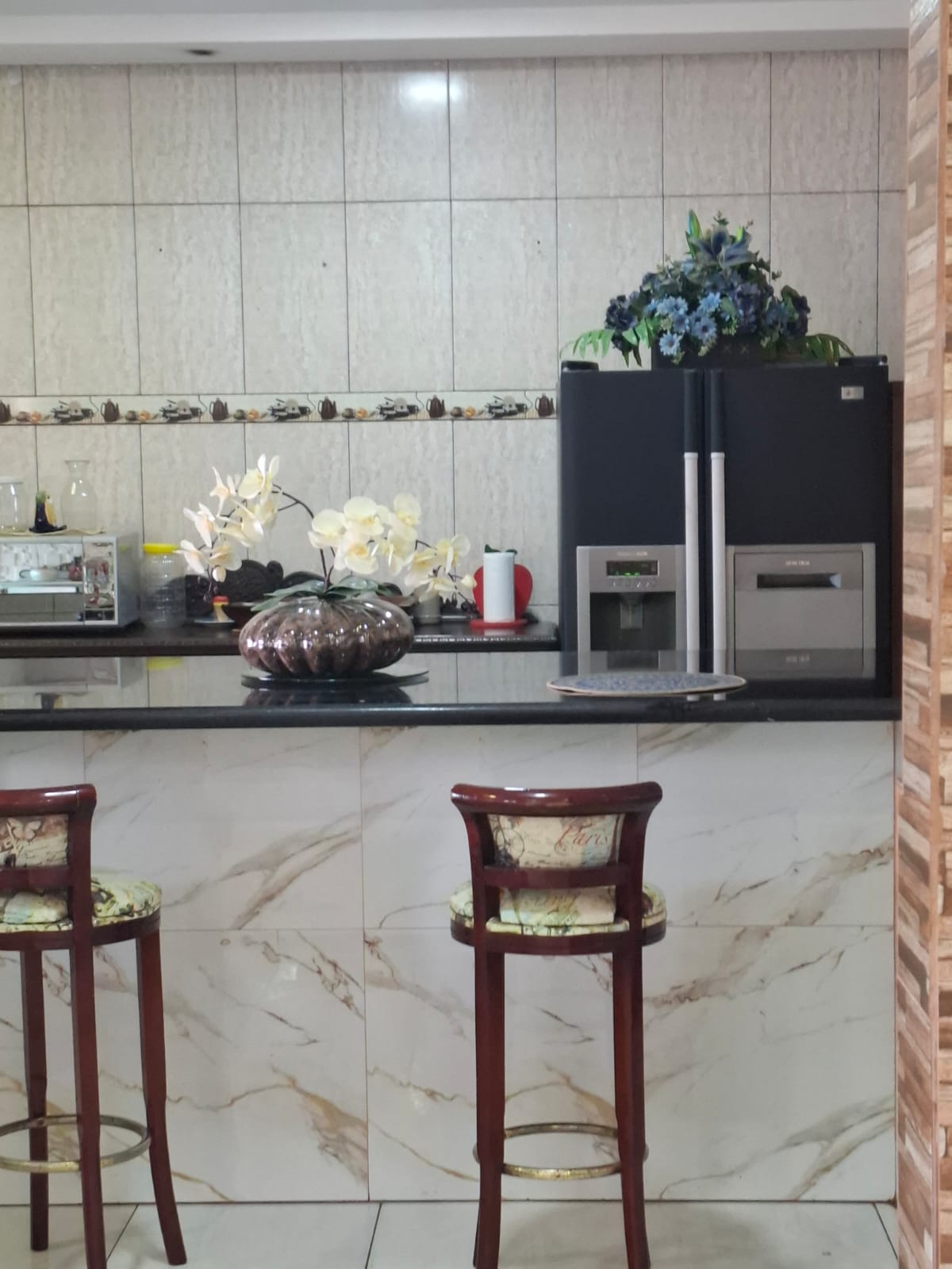 • Bancada em mármore com acabamento em madeira